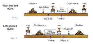 The Four Foot point equipment can be located on either the left or right-hand side of the negative traction rail. The position of the positive traction rail governs the type of layout to be used as the majority of the equipment should be at continuous rail potential; where possible the continuous rail is always next to the positive rail.