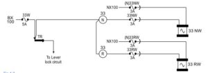 Fig 1.3 shows a typical point control circuit. The outgoing control lines 33NW and 33RW are fed from the main 33W fuse via the Normal and Reverse contacts on the point lever shaft. The lever contacts are arranged so that only one can make them at any one time, thereby only one of the point auxiliary valves can energise at any given time. For this to occur, the lever shaft must be either fully Normal or fully Reverse.