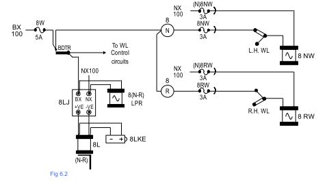 Point Control Circuit :- Fig 6.2 shows the Point Control circuit for a right hand turnout set of Clamplocks. The WL detection contacts are cut into the NW and RW control lines to prevent the WL being damaged by the drive lock slide pushing against the thin WL dab. The full retraction of the WL is proved by its respective bottom limit switch. The points shown laying normal in Fig 6.1 are a R.H. turnout.